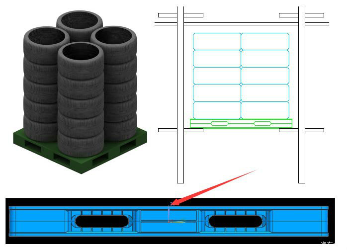 通過圖片對比可以發(fā)現(xiàn),如果使用塑料托盤與貨架搭配,配合機械叉車是不是存取產(chǎn)品變的更方便了呢。這種塑料托盤一般設(shè)計成長寬相同的正方形,并且以雙面網(wǎng)格或者雙面平板為主。因為要放置四摞輪胎,所以要求塑料托盤的尺寸一般在1.6米以上,并且內(nèi)置鋼管以增加其強度,在托盤的中心位置可預(yù)留RFID卡槽,以實現(xiàn)存儲的自動化。