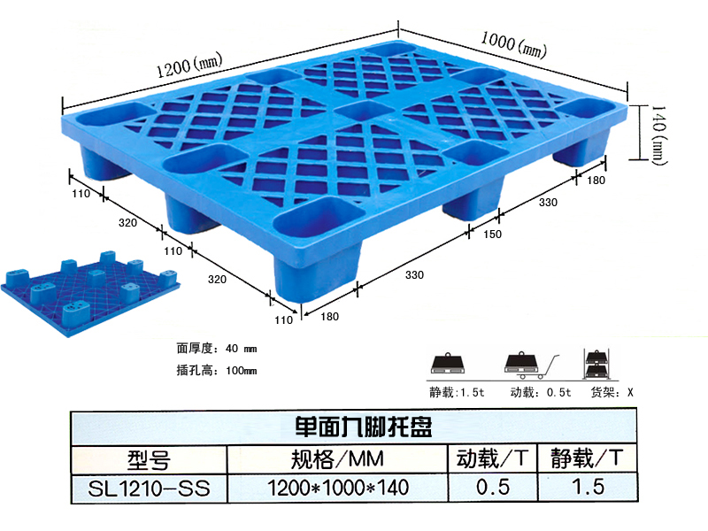 九腳網(wǎng)格塑料托盤(pán):九腳網(wǎng)格托盤(pán)其底部是有‘九個(gè)腿’組成的,表面為‘網(wǎng)格’狀,顧行業(yè)為方便稱(chēng)其為九腳網(wǎng)格托盤(pán)(如圖),九腳網(wǎng)格托盤(pán)大多型號(hào)的都為輕型的塑料托盤(pán),不易用于上貨架或者較重貨物的周轉(zhuǎn)使用,大多情況下九腳網(wǎng)格塑料托盤(pán)都是用來(lái)倉(cāng)庫(kù)貨物墊倉(cāng)板防潮使用,對(duì)于輕型貨物的周轉(zhuǎn)也可。